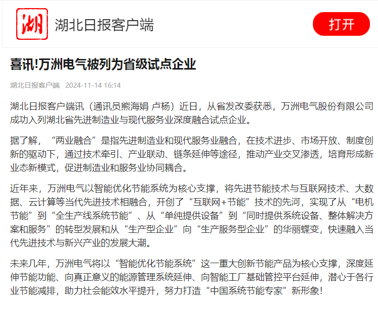 湖北日報(bào)客戶端訊(通訊員熊海娟 盧楊)近日,從省發(fā)改委獲悉,萬洲電氣股份有限公司成功入列湖北省先進(jìn)制造業(yè)與現(xiàn)代服務(wù)業(yè)深度融合試點(diǎn)企業(yè)。