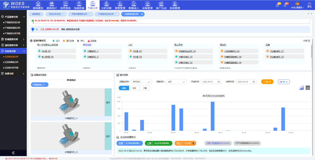 5、對(duì)水泥廠的各工段的主機(jī)設(shè)備和輔助設(shè)備之間設(shè)置關(guān)聯(lián)關(guān)系及空轉(zhuǎn)判別條件,對(duì)主機(jī)設(shè)備關(guān)停,而輔助設(shè)備沒(méi)有關(guān)停的情況進(jìn)行及時(shí)報(bào)警,并計(jì)算因此導(dǎo)致的能源浪費(fèi)量,幫助企業(yè)管理者詳細(xì)了解設(shè)備關(guān)聯(lián)運(yùn)行情況,將異常定位到具備班組,解決以前有制度但執(zhí)行不到位情況,通過(guò)報(bào)警功能提醒操作人員及時(shí)操作,減少能源浪費(fèi)。