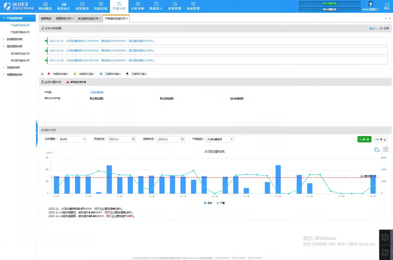 5、單耗、產(chǎn)量關(guān)聯(lián)分析節(jié)能。通過(guò)產(chǎn)品能效分析發(fā)現(xiàn)生料工區(qū)單耗存在異常情況;將能耗異常告知用戶后,并指導(dǎo)用戶通過(guò)系統(tǒng)發(fā)現(xiàn)份生料磨主電機(jī)、循環(huán)風(fēng)機(jī)電機(jī)運(yùn)行負(fù)荷均高于額定負(fù)荷的80%,且單耗均處于16.60-18.9kwh/t之間,合理調(diào)整生料磨主電機(jī)、循環(huán)風(fēng)機(jī)負(fù)荷比例,保證負(fù)荷率處于75%~80%之間,生料工區(qū)單耗控制在了16.50kwh/t以內(nèi),平均每天減少電量7500-8000kwh,按全年生產(chǎn)100天計(jì)算,每年可約電費(fèi)45萬(wàn)元。